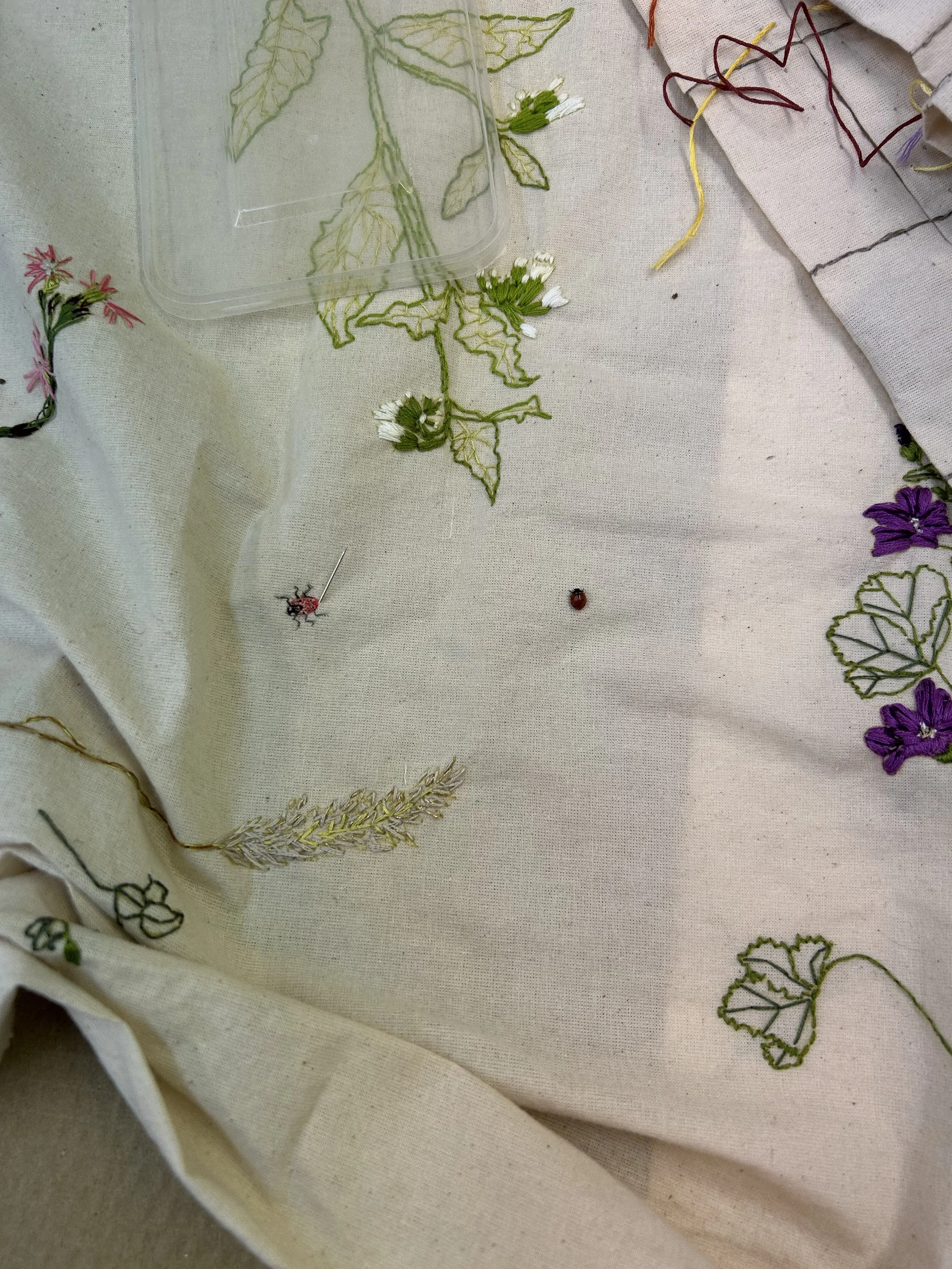 At the end of September 2025 I completed a textile piece which records some of the flowers blooming on Burgess Field from March (Blackthorn) to June (Field Poppy).