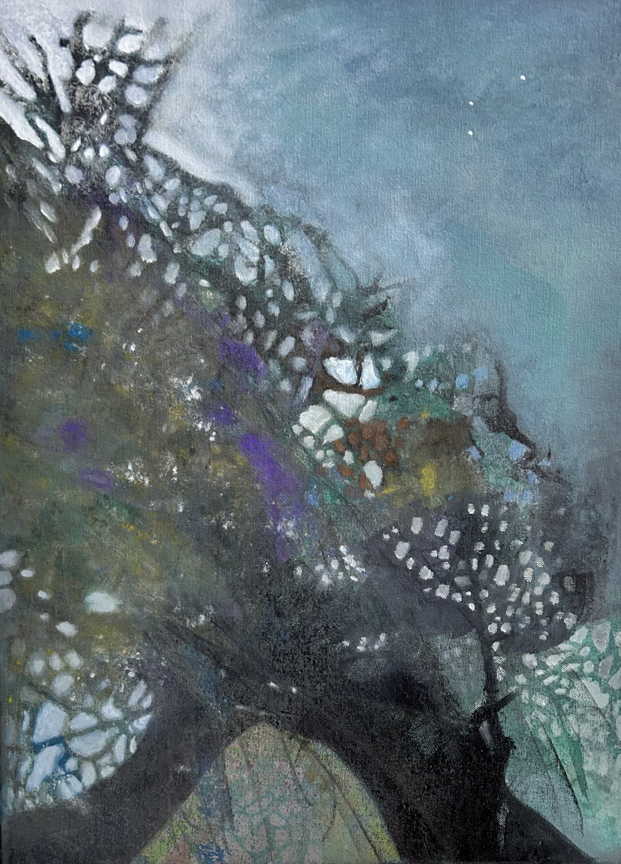 The second image is of a recent painting which derives from walks and observations on Burgess Field. The hawthorn trees are a treat, winter and summer. This is an image of two of them entangled on a winter’s night under the stars, waiting for Spring.