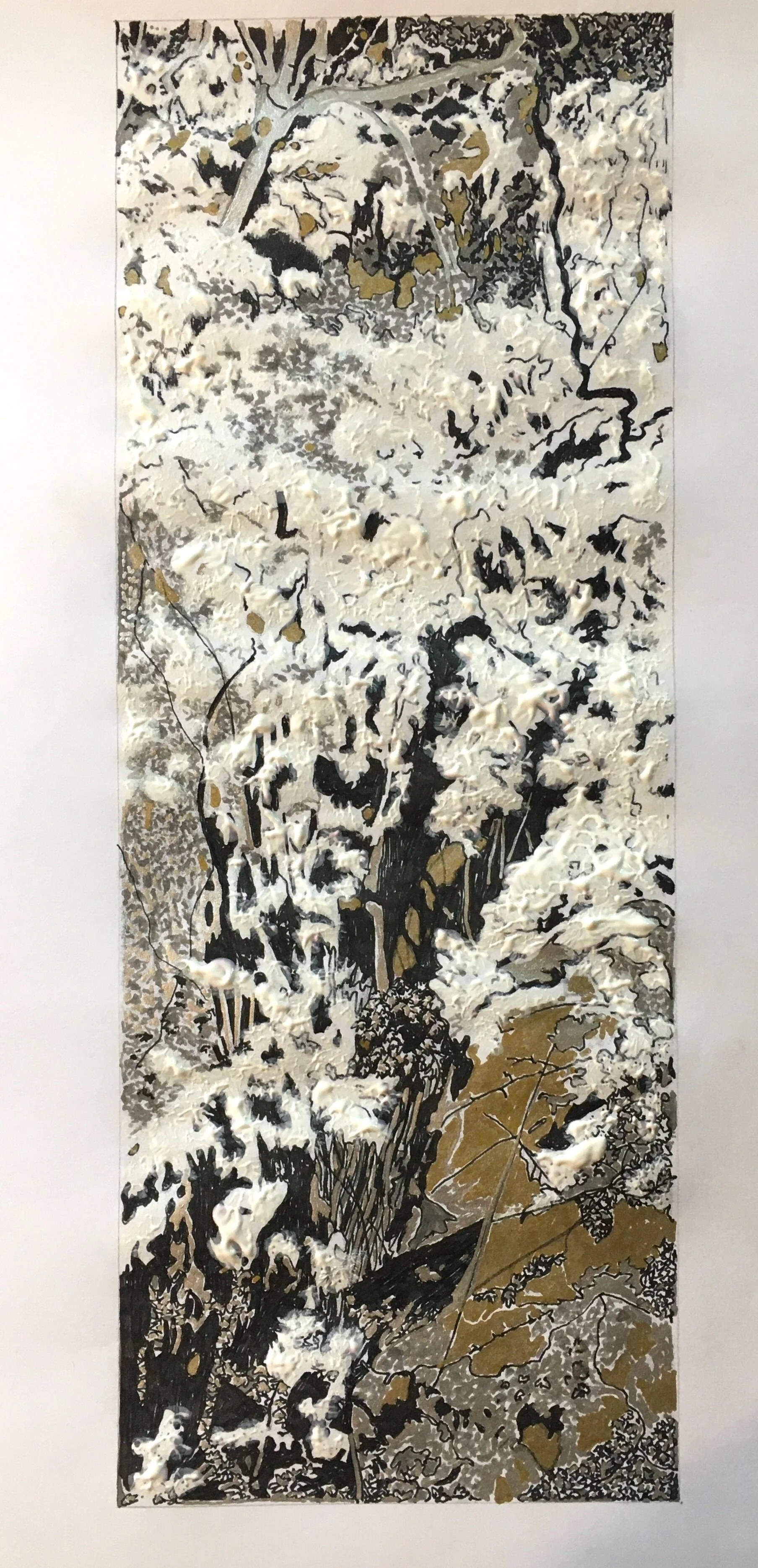This drawing recalls the confusion, the chill and the loneliness of the first days of Lockdown 2020. The white poplars on Wolvercote Lakes were just coming into leaf - it seemed unwillingly. The crows were defending their right to nest in them and seeing off the raven. Meanwhile the bird song at dawn and at dusk was increasing in volume.